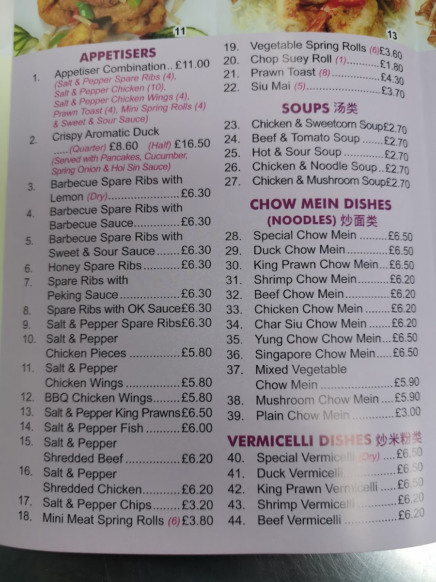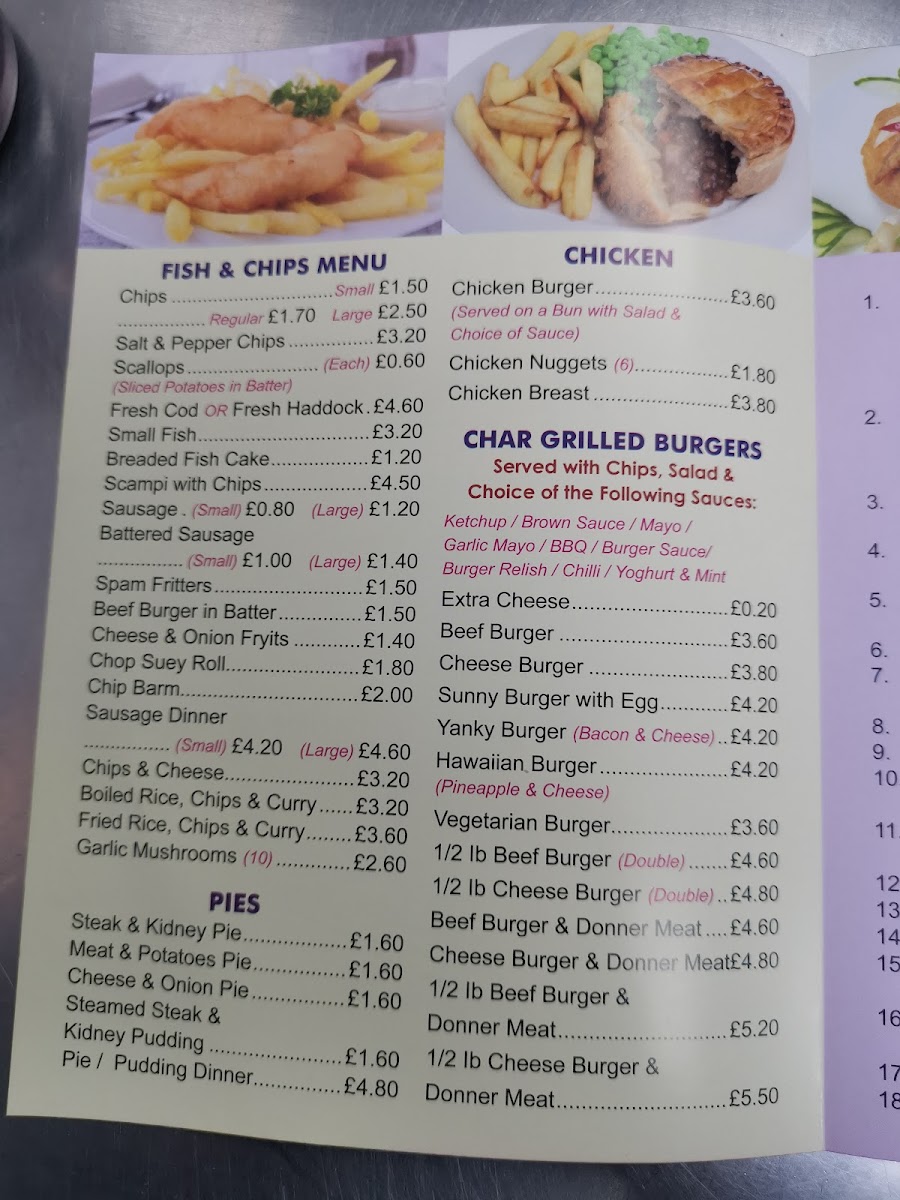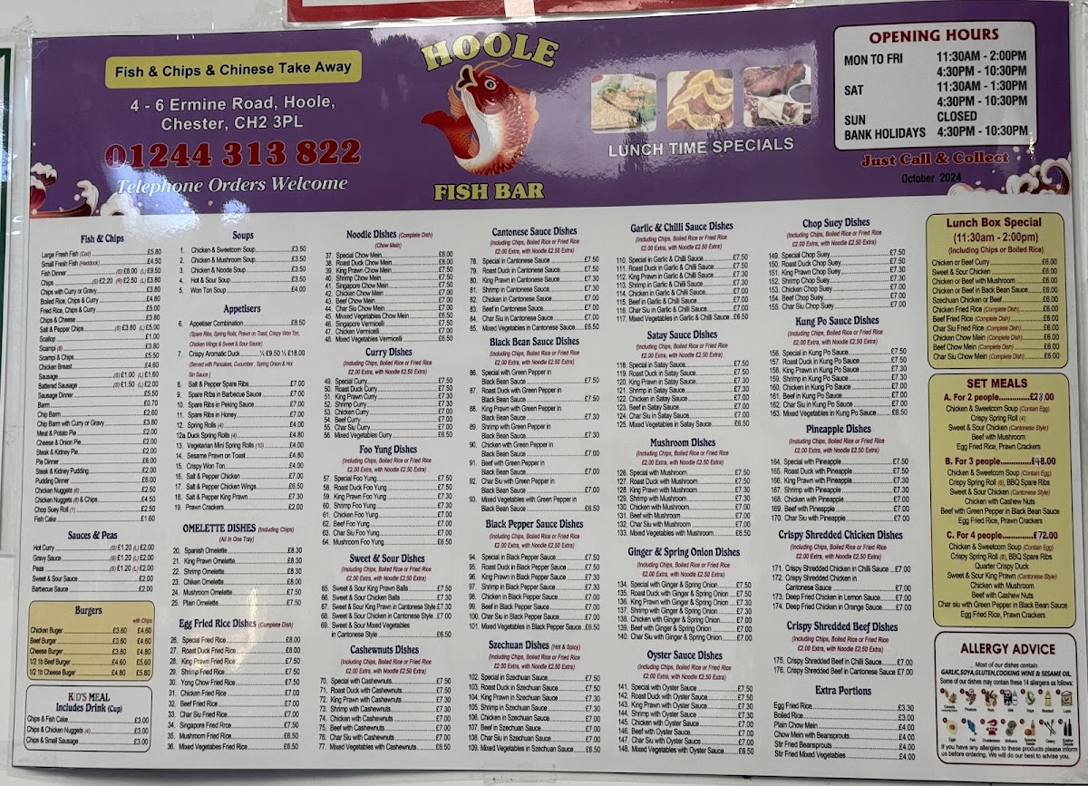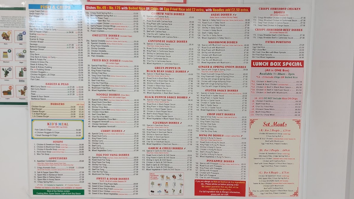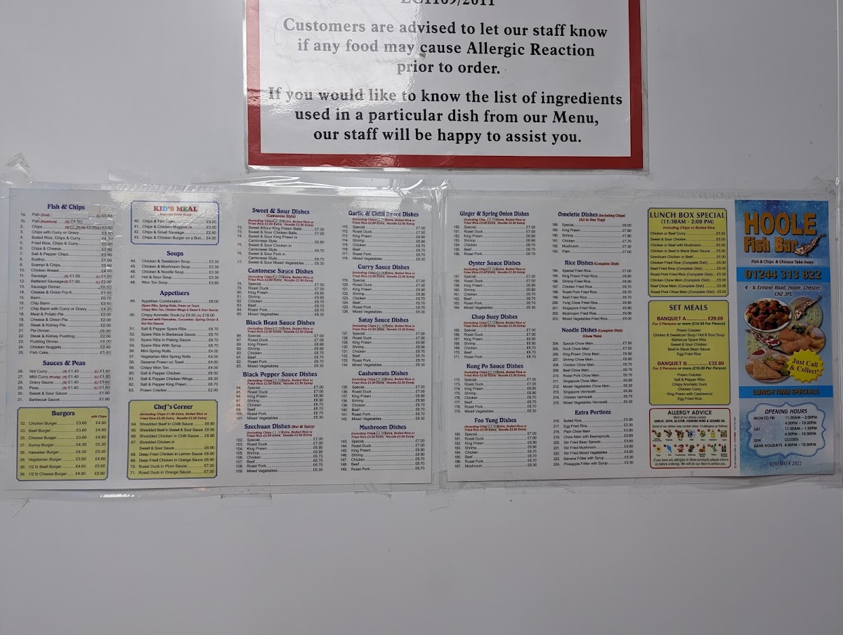 Hoole Fish Bar offers a diverse menu with an array of options that cater to all tastes, making it a perfect choice for casual dining. For starters, the Appetiser Combination and Crispy Aromatic Duck stand out as popular choices, while the Barbecue Spare Ribs with Lemon and Salt & Pepper Chicken Wings provide flavorful beginnings. For main courses, there’s a wide variety, including comforting Fish & Chips with options like Fresh Cod and Scallops, or a hearty Steak & Kidney Pie or Chicken & Mushroom Pie. If you're in the mood for something more adventurous, try the Shredded Beef in Chilli Sauce or Kung Po King Prawns from the Chef's Corner. The noodle and rice dishes, such as Special Fried Rice and Beef Chow Mein, are staples, and the Szechuan Chicken or Curry Dishes bring a spicy kick. For those with a lighter appetite, the Omelette Dishes, like Special Omelette or Duck Omelette, offer a satisfying yet simple option. The restaurant also caters to children with Chips & Fish Cake or Chicken Nuggets. With lunchtime specials like Small Fish & Chips and an assortment of Filled Baps such as Bacon & Egg, there's something to suit every preference. Overall, Hoole Fish Bar’s extensive menu offers a balance of familiar comfort food and bold flavors, ensuring a satisfying experience for all.